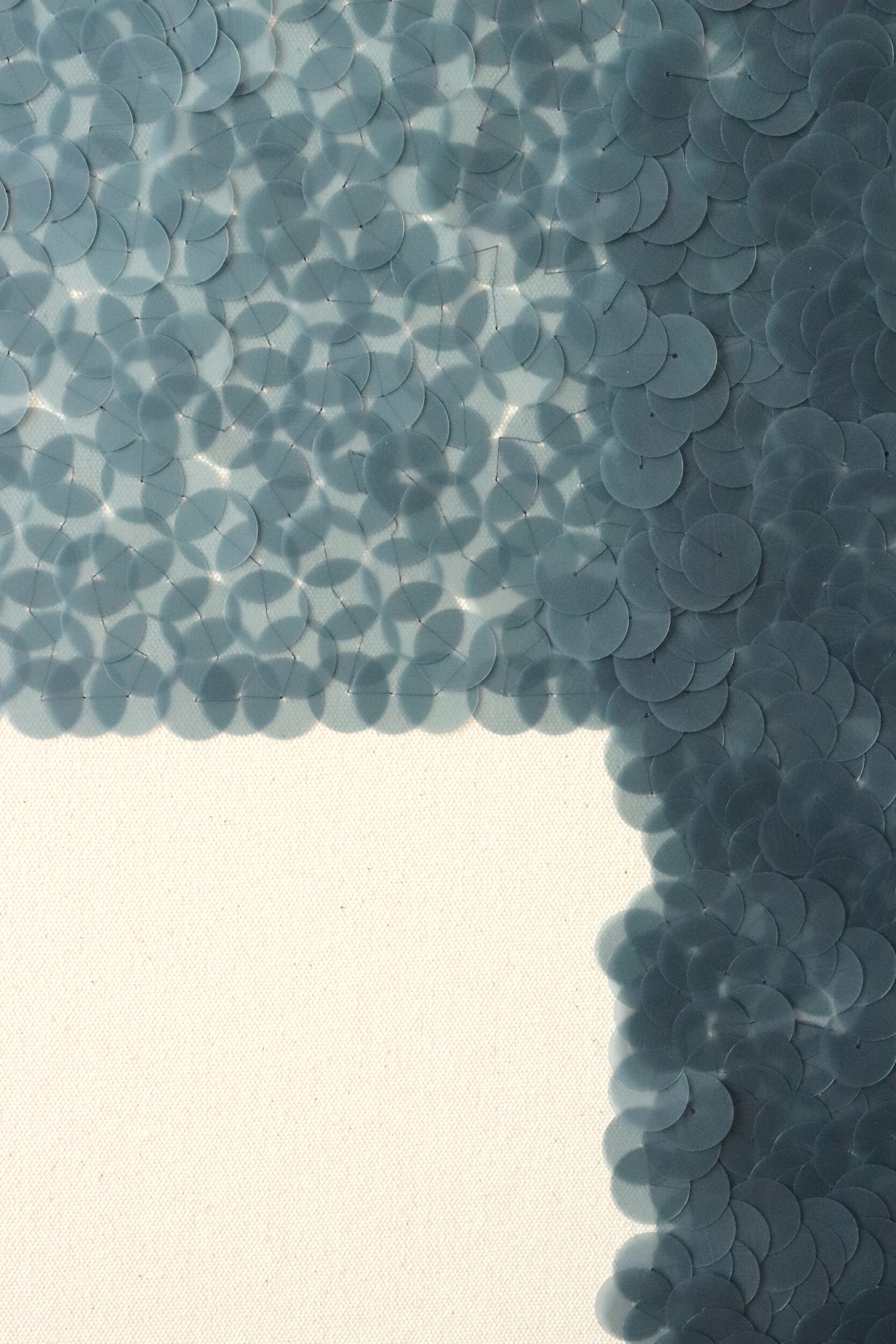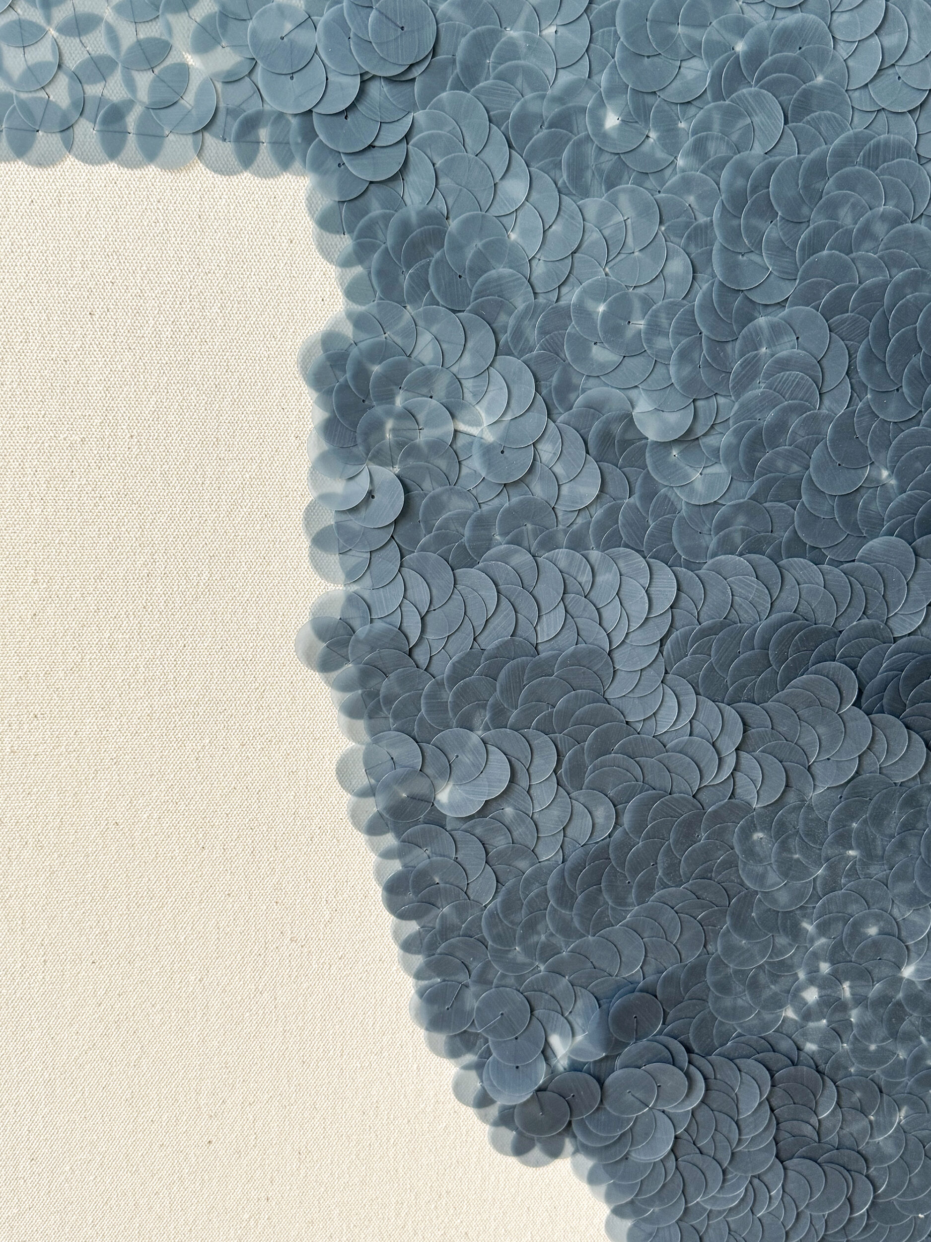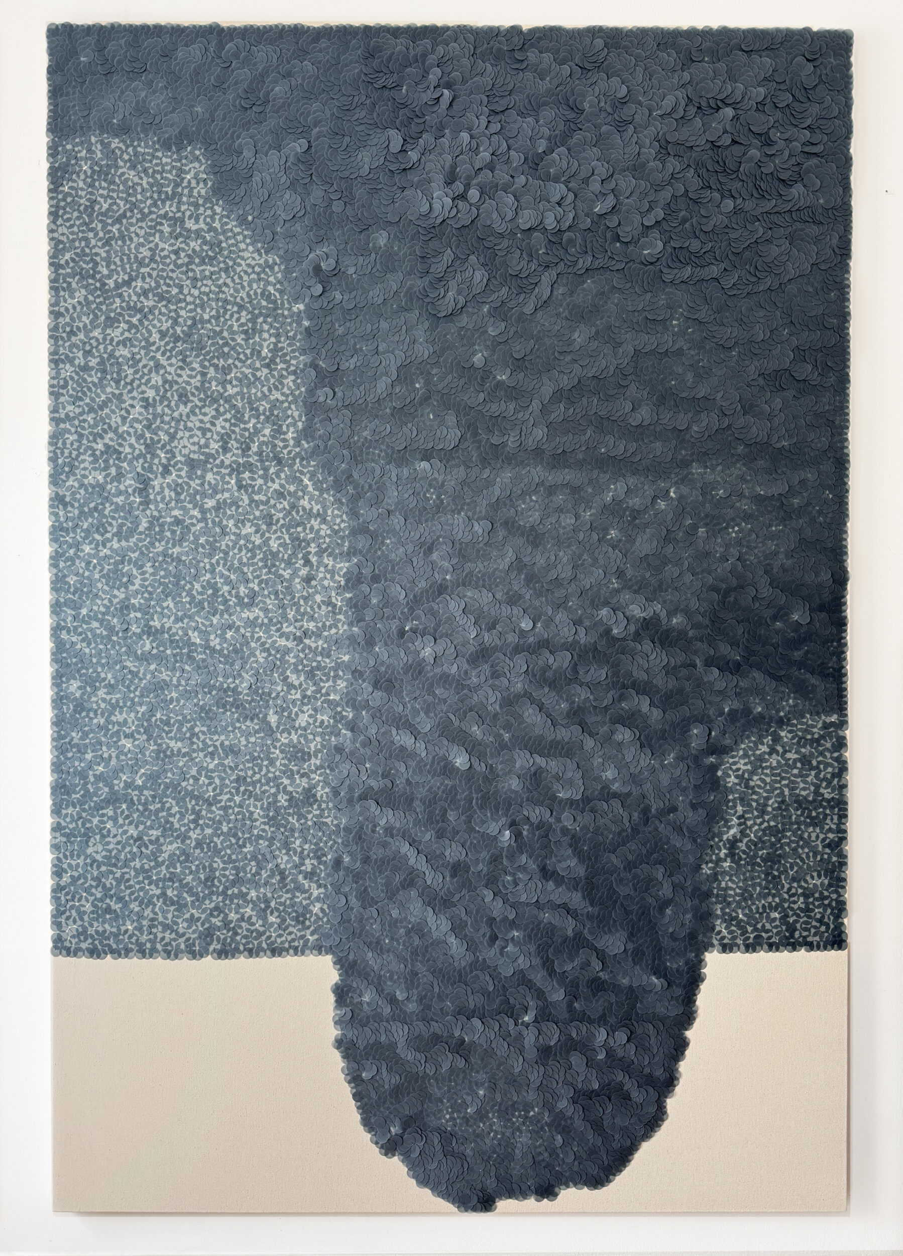Through an intimate reflection on time, she decontextualizes couture embroidery to situate it within a plastic field where matter, rhythm, and process stand in contrast to today’s industrial pace. Her approach is based on the repetition of gesture, the imprint of the body, and the memory of movement: she embroiders on the reverse side of the canvas, without seeing the result, allowing the thread, the rhythm of the needle, and unpredictability to guide the creation.
