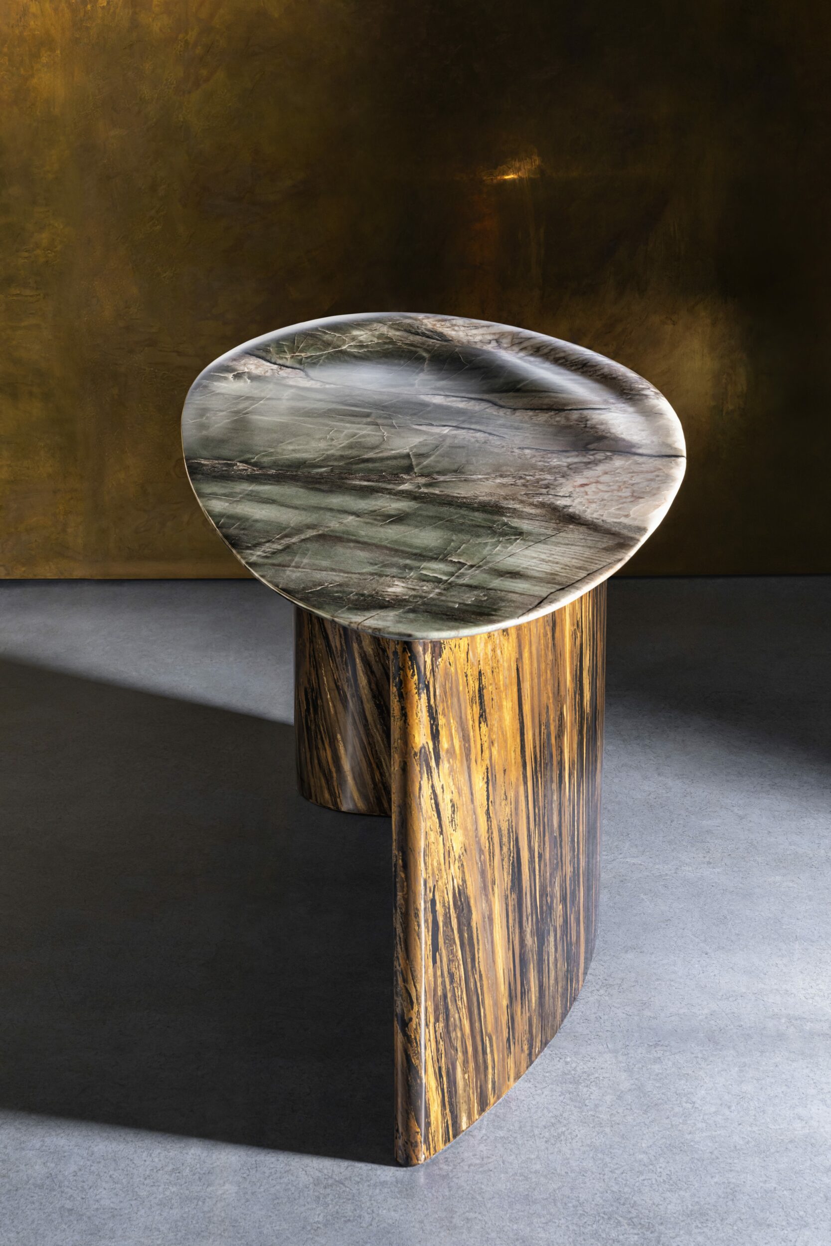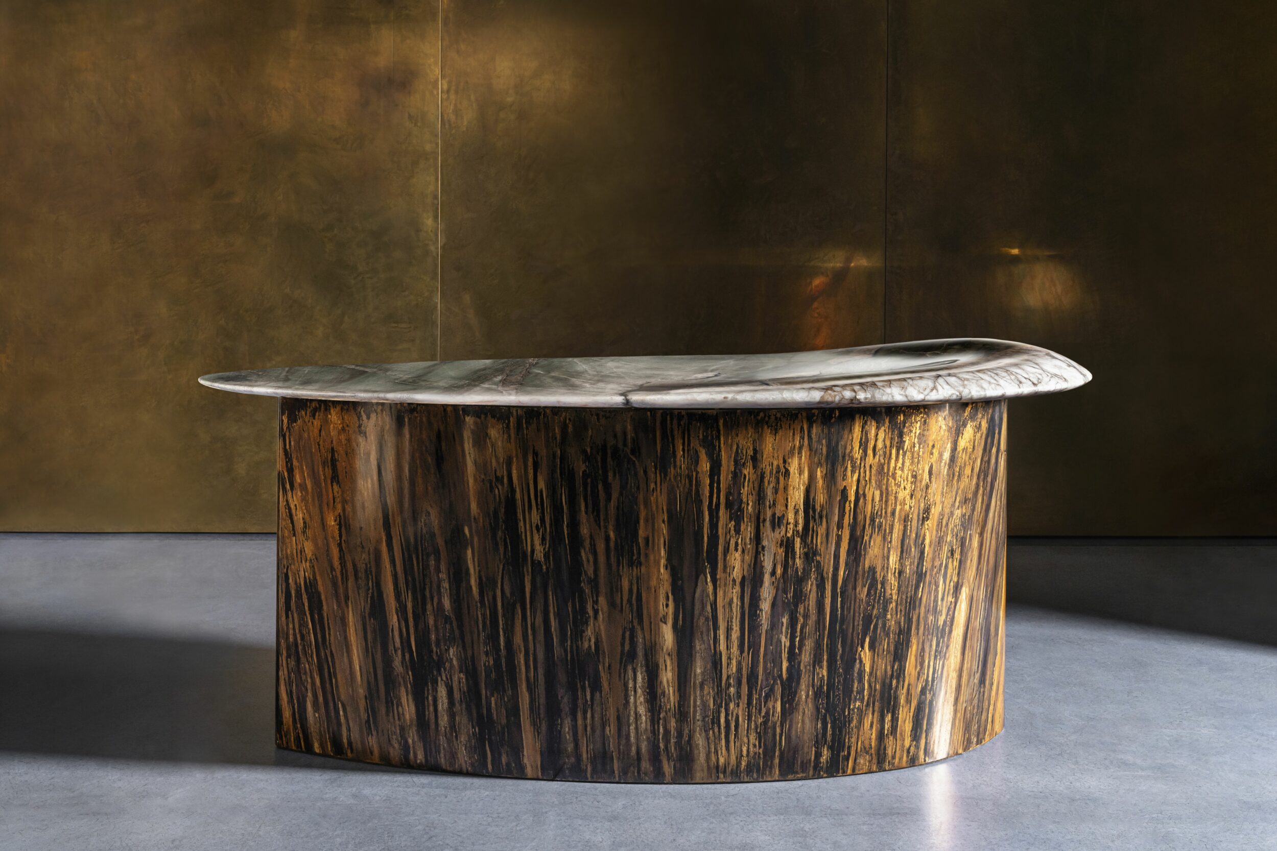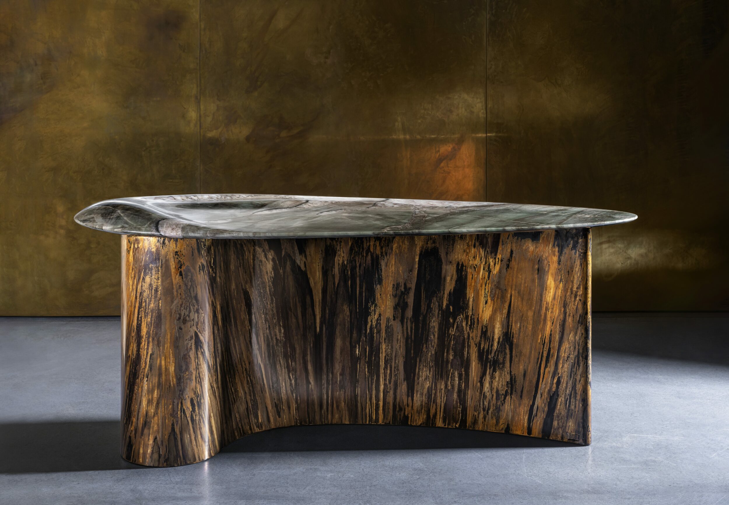 Milanese artist Gianluca Pacchioni developed a passion for metal work in the 1990s while frequenting the artistic scene in Paris. An autodidact, he returned to Milan and perfected his skills working with Italian craftsmen. Forging steel himself in his workshop, he began working with bronze, brass and aluminium to create limited edition sculptures and furniture.  Constantly experimenting, his innovations involve liquid metals and patinas. The pieces he creates show the contrast between raw materials – metal of course, but also stone or concrete – and the resulting beauty that is born from the artist’s skill and sensitivity.  Likewise, light plays a fundamental role in his works. It amplifies the forms of expression, making them both visible and uncertain. The sculpture reveals the inner self.