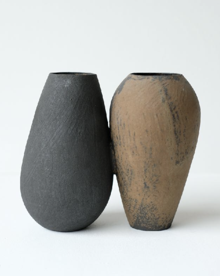 Linda Ouhbi was born in 1984 at Casablanca. She lives and works in Paris. Linda Ouhbi handcrafts stoneware pieces using the flat coil technique, a slow and meticulous process that anchors her work in an essential temporality, where each piece evolves with every gesture. Far from mere construction, this method reflects a search for balance, a pursuit of the right form, where the delicacy of the walls becomes a signature element. Her works transcend utility; they assert themselves as autonomous volumes—sculptures where the imprint of time and hand converge. Drawing inspiration from both ancestral craftsmanship and contemporary forms, she positions her work within a dialogue between past and present, in continuity with a universal ceramic language. The treatment of surfaces—particularly the glazes she formulates herself—goes beyond ornamentation. It extends the expression of the clay, revealing its flaws, textures, and memory.Mineral hues and oxidized effects lend her pieces an almost archaeological dimension, as though they had traversed time.