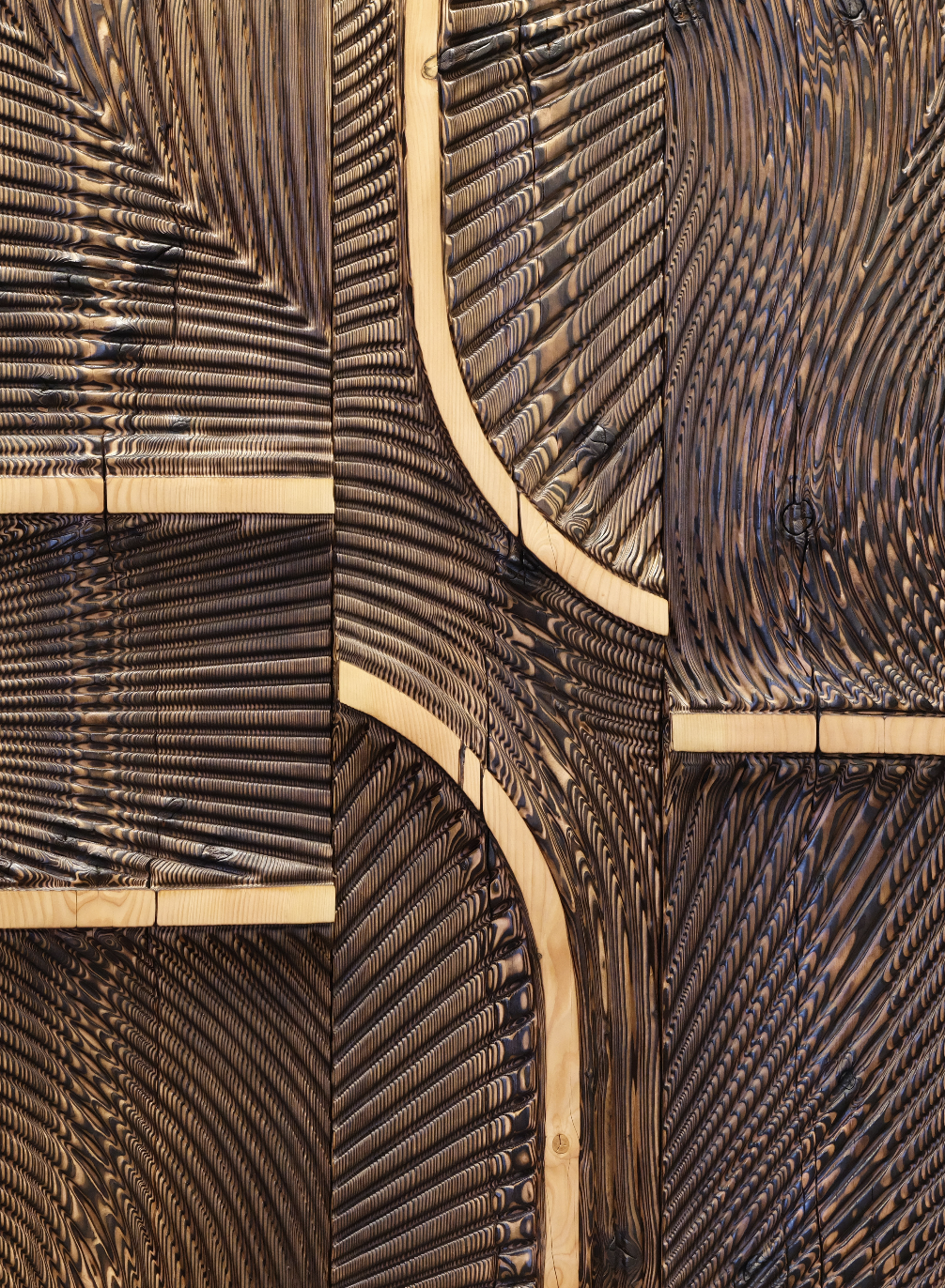 Les créations d’Etienne Moyat sont empreintes de son respect et de son amour pour la nature. Ebéniste de formation, il réalise des pièces uniques et monumentales, destinées à des projets haut de gamme pour des résidences particulières, des hôtels, des yachts. Il travaille directement à partir d’arbres : après avoir dessiné une esquisse, il le sculpte, le brûle, le brosse, le vernit, mais surtout lui rend hommage en tant que matériau vivant, vecteur d’émotion et d’expérience. Paradoxalement, son utilisation de la tronçonneuse comme outil de prédilection lui permet un geste libre et instinctif. Son travail, intimement lié au temps et au mouvement, occupe l’espace de lignes d’énergie fluides.