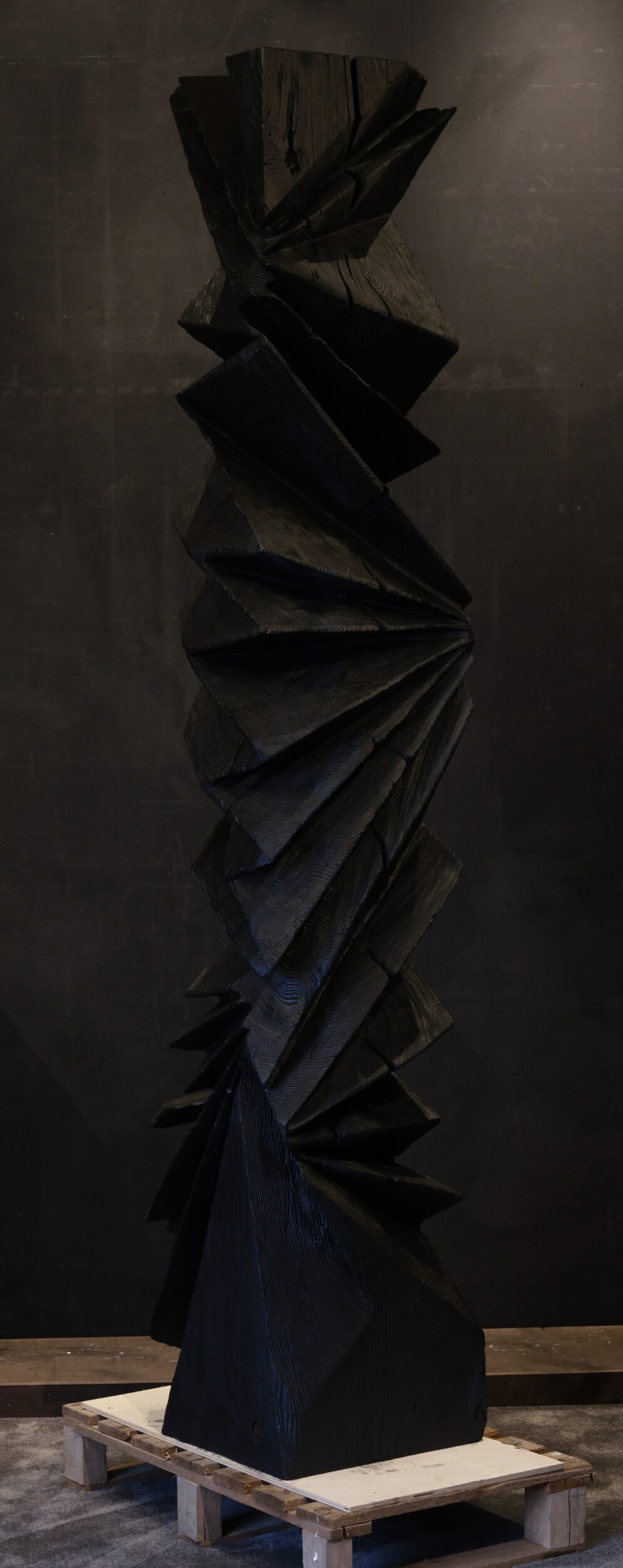 Les créations d’Etienne Moyat sont empreintes de son respect et de son amour pour la nature. Ebéniste de formation, il réalise des pièces uniques et monumentales, destinées à des projets haut de gamme pour des résidences particulières, des hôtels, des yachts. Il travaille directement à partir d’arbres : après avoir dessiné une esquisse, il le sculpte, le brûle, le brosse, le vernit, mais surtout lui rend hommage en tant que matériau vivant, vecteur d’émotion et d’expérience. Paradoxalement, son utilisation de la tronçonneuse comme outil de prédilection lui permet un geste libre et instinctif. Son travail, intimement lié au temps et au mouvement, occupe l’espace de lignes d’énergie fluides.